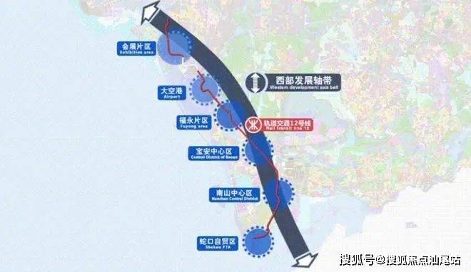 地铁12号线由南向北依次串联蛇口自贸区、南山中心区、前海自贸区、宝安中心区、机场和会展片区,是支撑深圳西部发展轴的轨道交通骨干线。