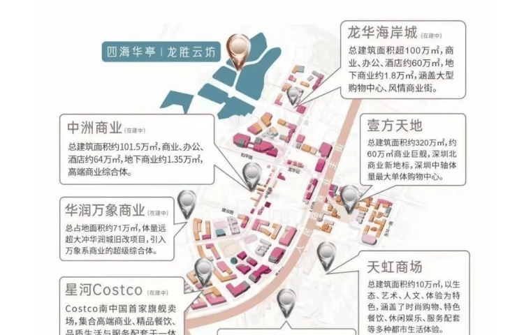 除自身商业和周边商业街、传统百货商场外,项目1.5公里范围内还分布有壹方天地商业、百佳华购物中心、龙华商业中心、RRL mall购物中心、天虹商场、华润万家等多个中大型优质集中式商业。