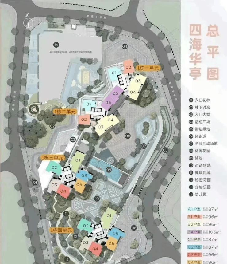 四海华亭,占地面积约1.7万㎡,建筑面积约16.4万㎡,容积率6.81,绿化率30.59%,共4栋51-52层高住宅,由1栋1-4单元组成,其中1栋1.2单元是3梯5户设计,1栋3.4单元是4梯6户设计,可售商品房有1044套,车位数1249个。