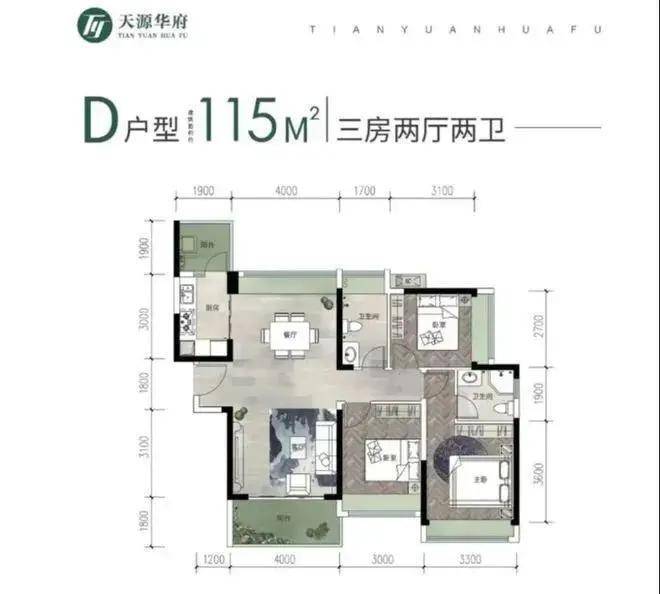 115㎡的3房2厅2卫,设计的是竖厅南北通透格局,LDKB(客餐厨阳)四位一体,客厅3.9米开间,3个卧室分别是2.7/3/3.3米的宽度,L型厨房,得房率:89.13㎡(包含赠送),阳台1.8米进深,西南朝向。