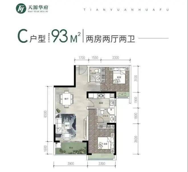 93㎡的2房2厅2卫,设计的是竖厅格局,LDKB(客餐厨阳)四位一体,客厅3.9米开间,2个卧室分别是3.1/3.3米的宽度,L型厨房,得房率:83.82%(包含赠送),阳台1.6米进深,西南朝向。