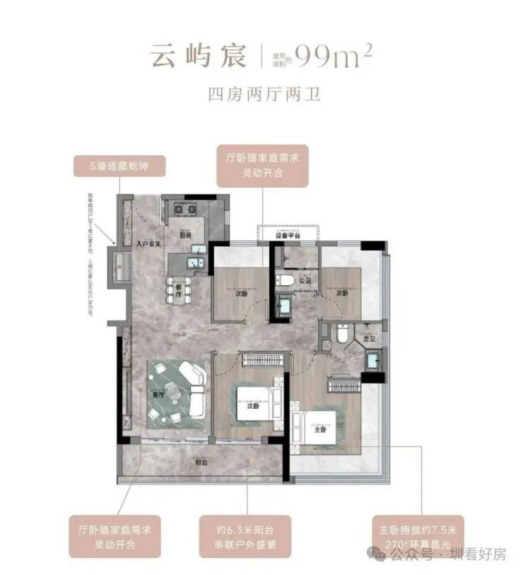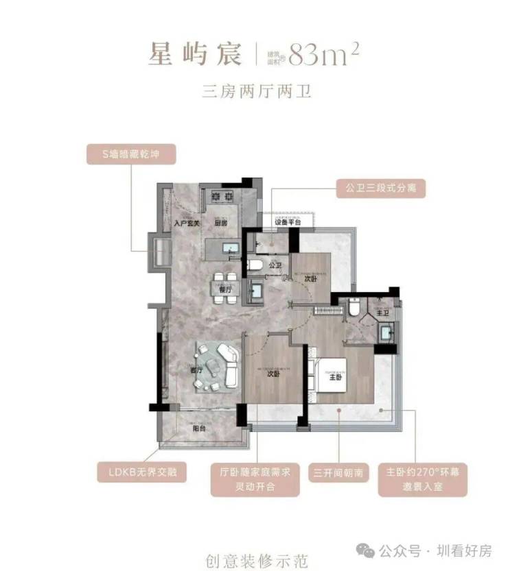 建面约83-133㎡3-4房宸式美学新著,LDKB巨幕方厅,跑道式景观阳台,小家化星级酒店主卧套房,270°环幕全景舱,客厅次卧无剪力墙灵动设计,实现超高实用率,每一户皆是颐安“超新一代作品”的匠心宣言。