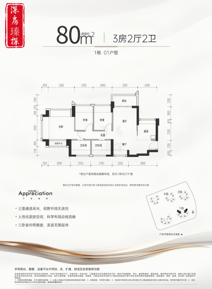80㎡的3房2厅2卫,设计的是竖厅南北通透格局,进门入户玄关,客厅3.2米开间,LDKB一体化设计,全屋9个飘窗面,分别做到了主卧18.38㎡/次卧7.32㎡/次卧7.16㎡(包含墙体飘窗),U型厨房,卫生间干湿分离,得房率约:104%(包含赠送),阳台主朝西北或东北向。