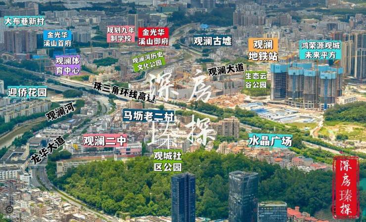 金光华溪山禾玺,位于深圳龙华区观澜街道,地处龙华区府行政中心核芯圈,占据“一圈一区三廊”发展格局的战略要地。项目紧邻九龙山数字城、鹭湖中心城及观澜文化小镇三大重点发展片区,受惠于大湾区及先行示范区政策叠加红利,是龙华未来城市更新的核心区域。周边规划涵盖行政、文化、科技等多重功能,未来将形成集产业升级与生态宜居为一体的综合性新城。目前虽存在部分城中村待改造,但多数已纳入旧改范围,区域发展潜力显著。