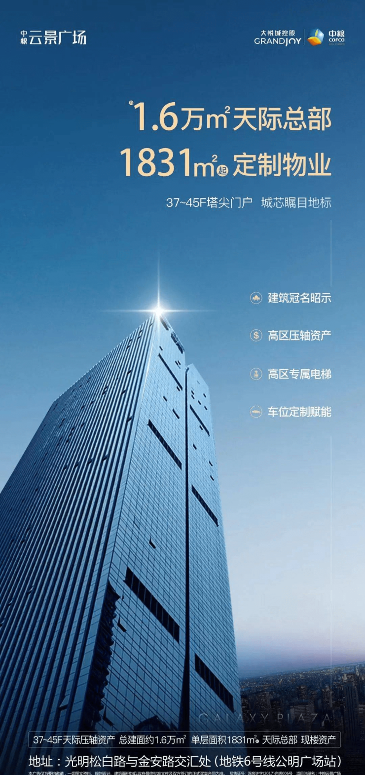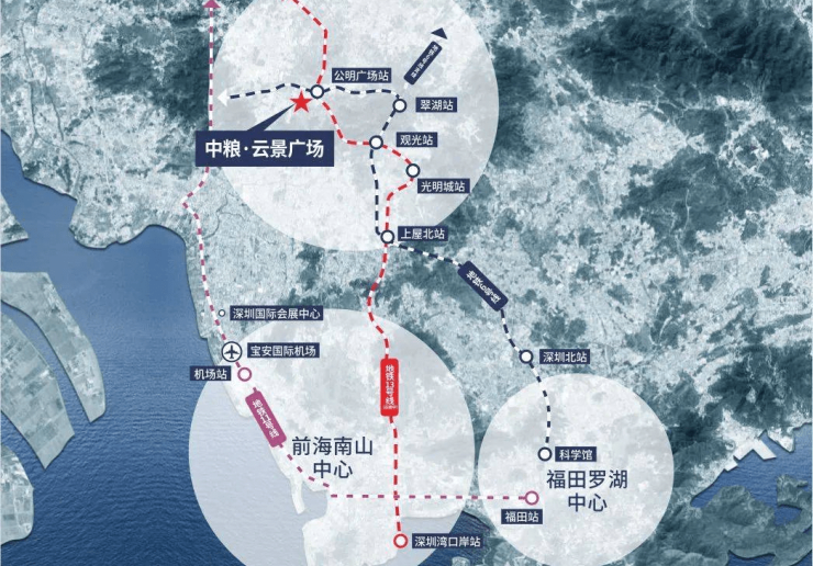 中粮云景国际广场_深圳光明写字楼出售,均价1.8-2.4万/平米;出售面积103-250-500-1000-1831-16000平米,均价1.8-2.4万/平米;双地铁上盖综合体:6号线/13号线(规划中)公明广场站联通地下商业,6号线已通车;光明区公明街道松白路与金安路交汇处(6号线公明广场站)