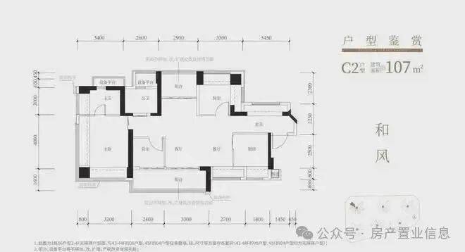 107㎡的4房2厅2卫,设计的是横厅南北通透格局,进门赠送约4㎡入户玄关,客餐厅5.9米开间,4个卧室分别做到了主卧17.9㎡/次卧9.48㎡/次卧8.47㎡/次卧6.06㎡(实测面积,去掉墙体),主卧+1个次卧270°飘窗,客厅连接次卧出5.7米长大阳台,U型厨房,得房率约102.5%(包含赠送),阳台主朝西南向。