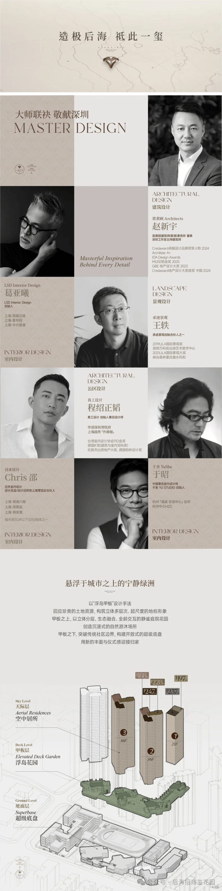 这次「后海招商玺」住宅设计采用“浮岛甲板”设计策略,四栋住宅落于甲板之上,独享甲板庭院花园。进而形成超级社区底盘 + 浮岛绿化甲板的垂直共生人居标杆。