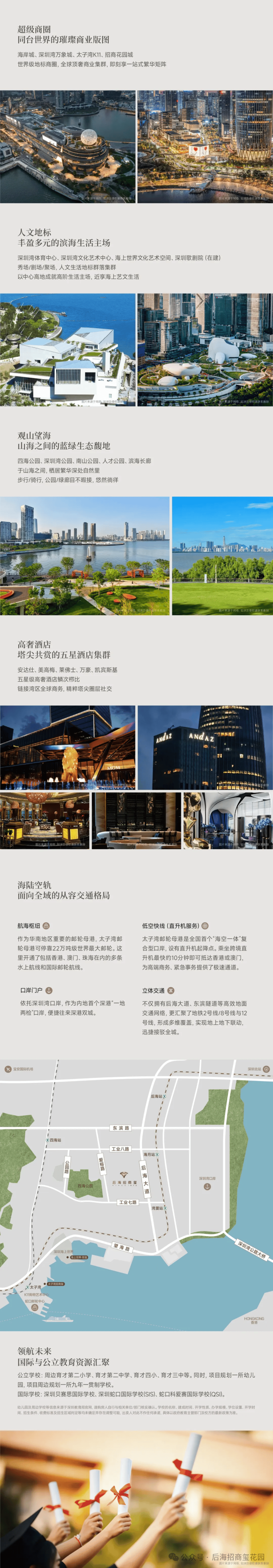 后海招商玺位于南山区招商街道后海大道以西、工业七路以北,地处深圳湾超级总部基地辐射范围,周边3公里内覆盖深圳湾体育中心、深圳湾公园、太子湾邮轮母港等城市地标,形成了“高端居住+滨海休闲+国际商务”的复合生态圈。
