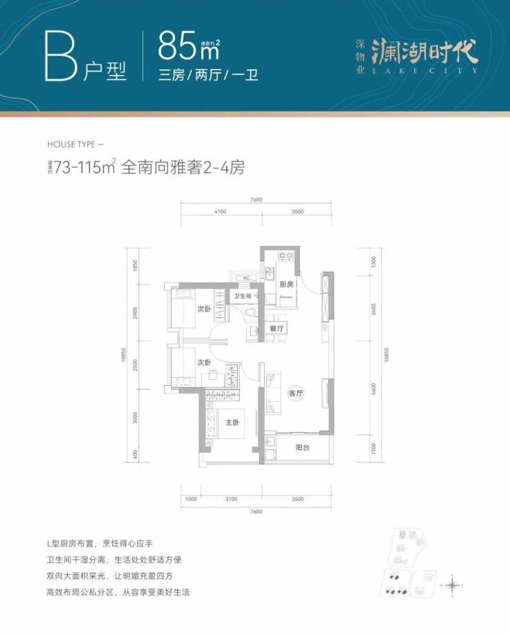 02/03/05户型,分布于1栋1/2/3单元,朝向为西南和东南,客厅3.5米开间,3个卧室分别做到了3.1米/2.9米/2.5米的宽度,L型厨房,得房率约78%(不含赠送)。