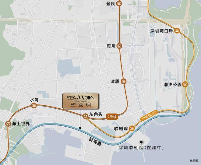 望海玥项目具体位于望海路和湾厦路交汇处,蓝漪花园以东、蛇口老街以南,毗邻蛇口广场,与地铁2号线及13号线(建设中)东角头站相距约200米。