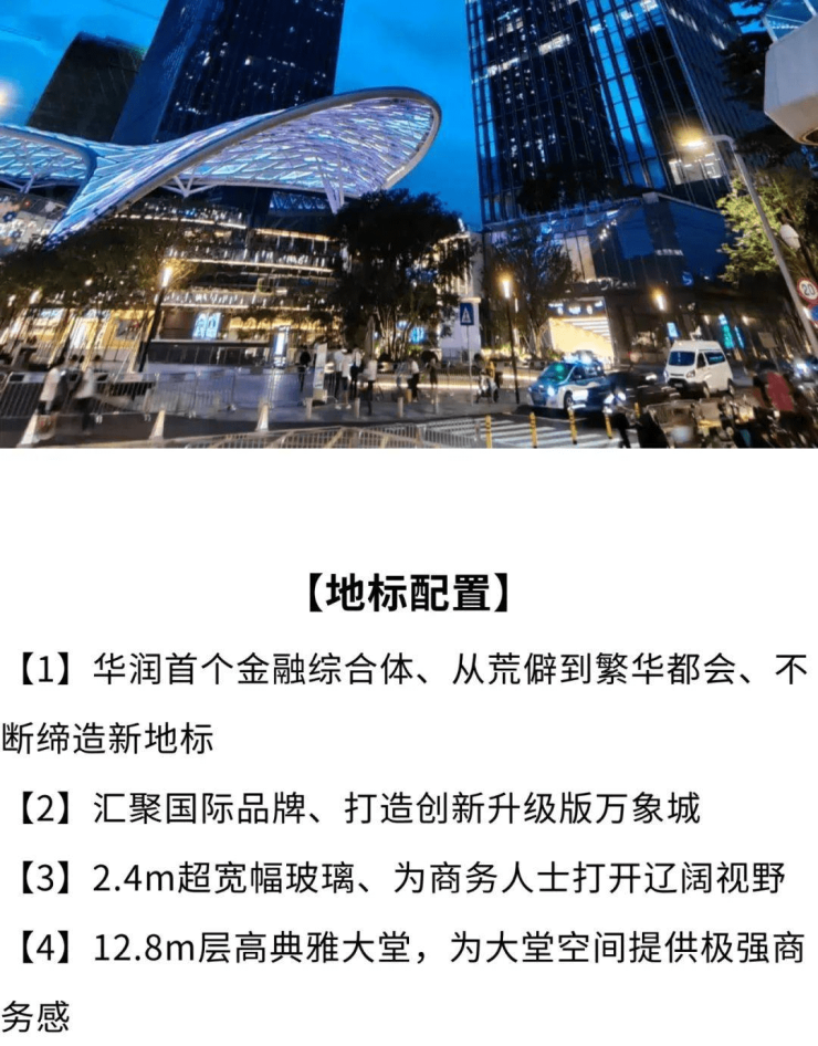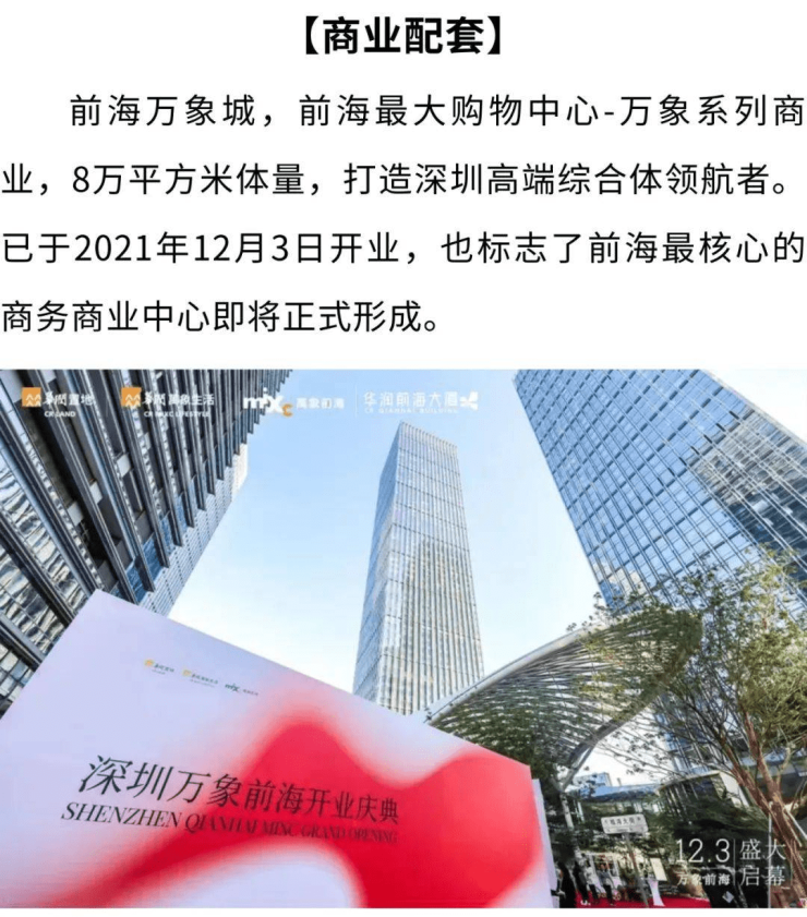 华润前海中心集国际甲级写字楼、高端购物中心、国际级精品公寓、星级酒店于一体,以4大城市业态的淬炼,以鲜活的方式制造前海的城市意象,成就国际金融城市的形象表率。其中万象前海(约8万平米商业配套),将有近200家品牌进驻,为都会精英人士量身定制一个融合社交休闲、精品时尚、餐飨美食、科技体验和文化分享于一身的创新生活空间,是一座创新版本的万象城。前海华润金融中心售楼处电话:400-088-3336