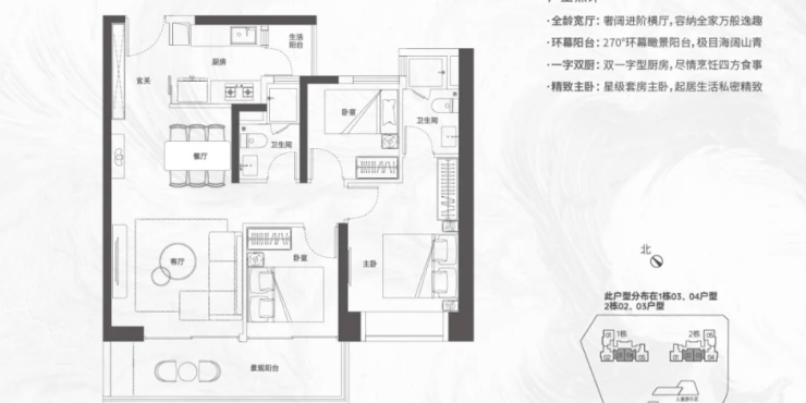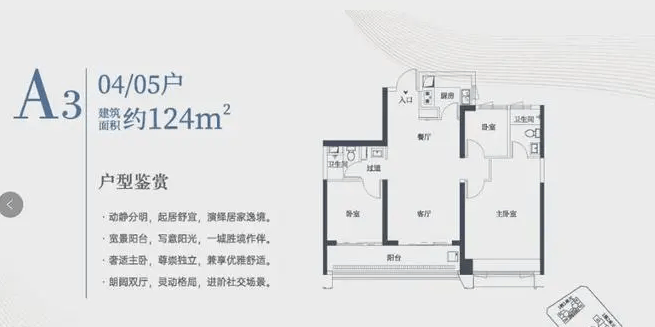 124㎡四房二卫(横厅):东南及西北朝向,提供不同的居住体验。