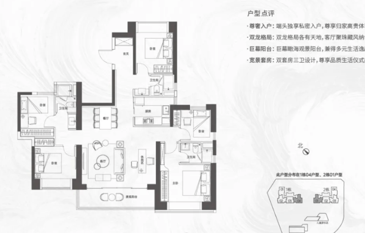167㎡5+1房三卫:同样位于32-43F高区,户数不多,南向看海,功能配置上完全满足家庭需求。