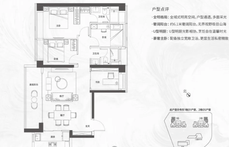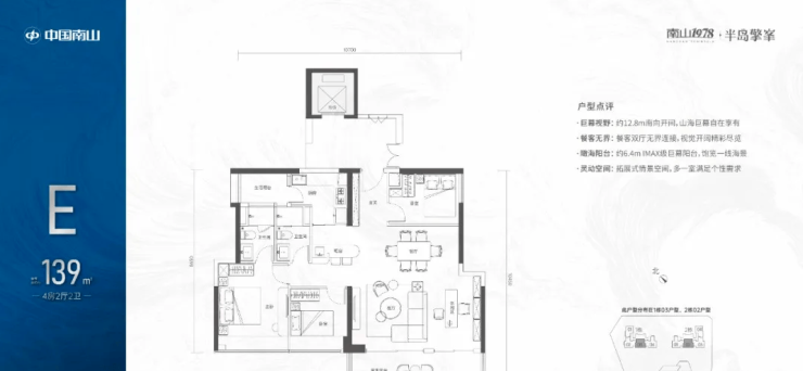 139㎡四房二卫:位于32-43F高区,户数非常少,南向看海,独立电梯厅面积达到20㎡。