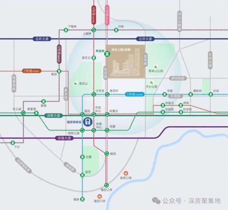无缝接驳地铁10号线冬瓜岭站,纵享福田“一中枢、双口岸、四核心”枢纽体系,再造引桥匝道升级微循交通体系,高效互联湾区城市与全球资本。