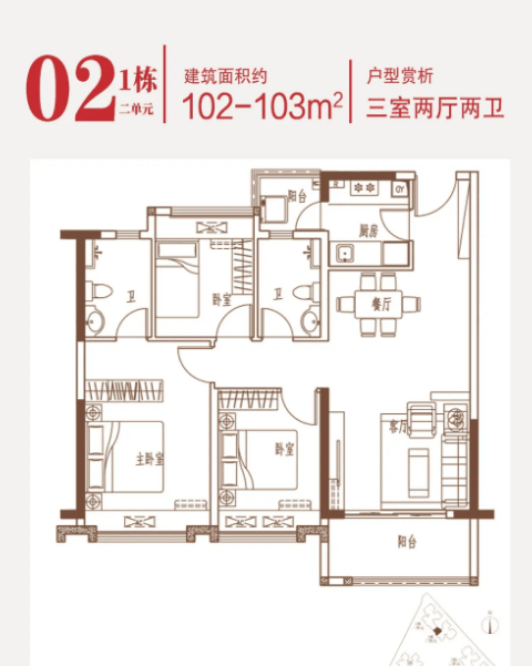 102-103㎡的3房2厅2卫这个户型面积更大,空间感更强。主人房不仅有独立卫生间,并且设计有步入式衣帽间,满足居者摆放衣物,精心搭配的需求,感受更加尊贵的居住