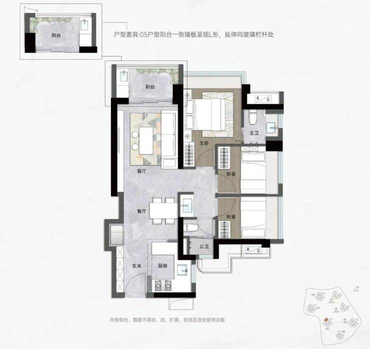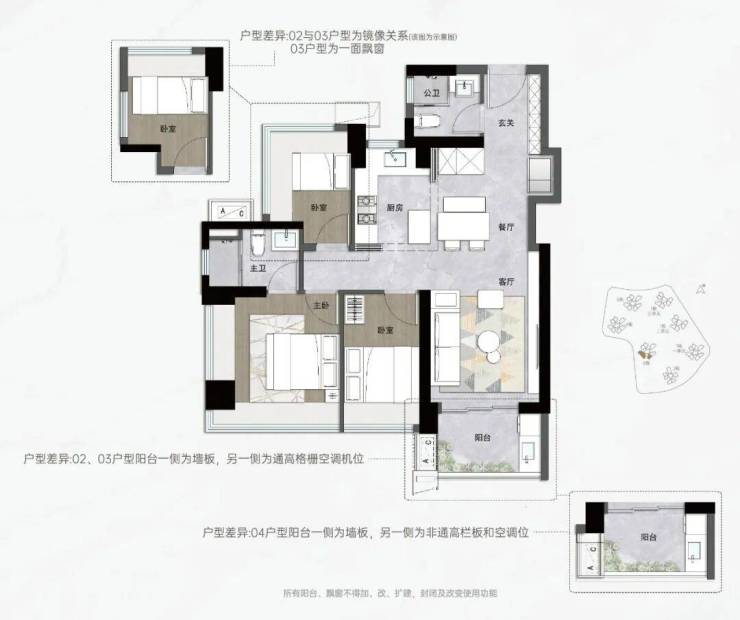 入门级的就是片区内罕有的约83㎡三房两卫,同样拥有主卧套房的私密、双次卧的方正和全屋飘窗,对二胎非常友好。