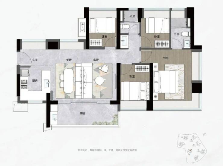 约89㎡三房两卫户型主打舒适,方正实用。
