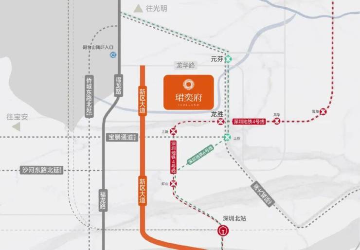 地铁:4号线龙胜站(约500米)、6号线元芬站(约800米),3站直达深圳北,5站速抵福田;城际:深大城际(在建中),3站直达机场;路网:新区大道、福龙快速路等主干道,串联福田、南山、宝安,通勤效率提升约20%。