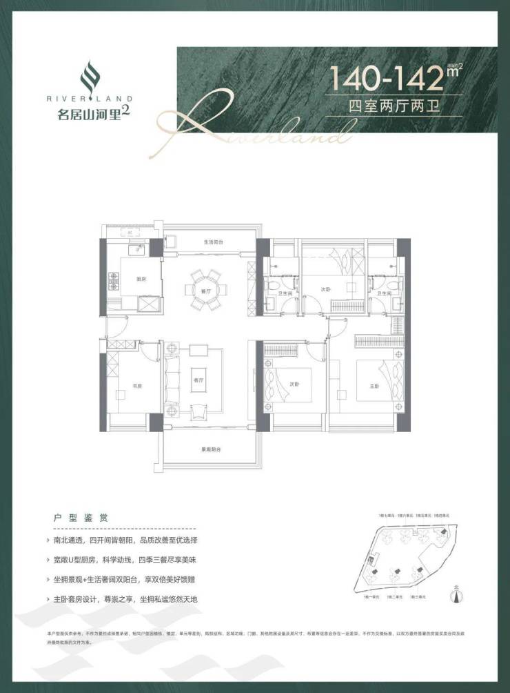 141㎡的4房2厅2卫,设计的是竖厅格局,客厅4.3米开间,南北通透双阳台,四开间朝南,全屋飘窗,U型厨房,得房率:74.83%(不含赠送),阳台1.5米进深,主朝东南向。