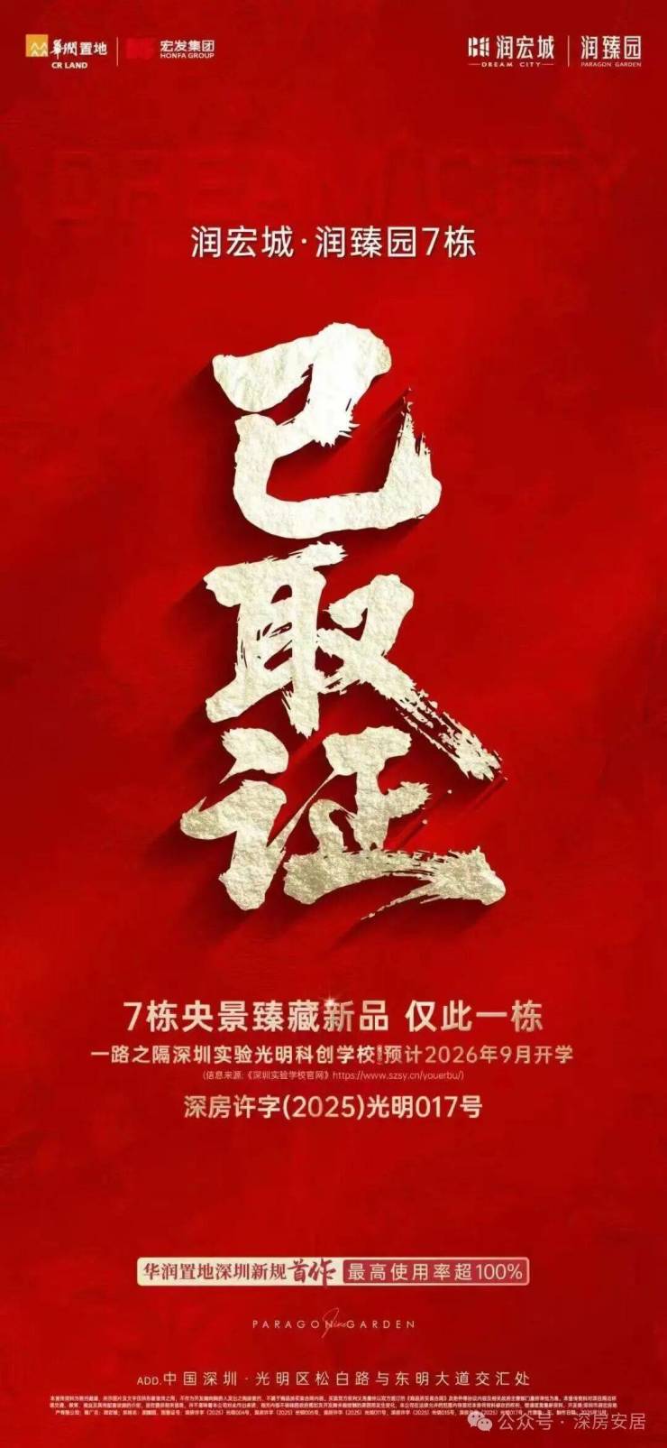 光明华润润宏城二期——润宏城·润臻园加推3栋共约288套,面积89-128㎡,备案均价4万/㎡,单价3.4-4.65万/㎡开盘约9.03折,折后均价约3.61万/㎡,折后单价3.06-4.2万/㎡,折后总价273-531万!可以直接认购