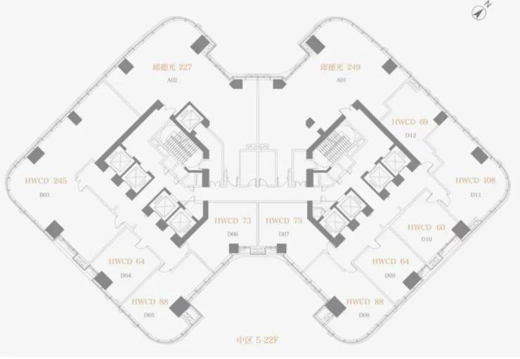 方胜纹双核心筒的设计使得整栋建筑更加高效和私密,并实现了双专梯电梯入户,为塔尖人群高效的工作和私密的生活而服务。转角处曲线设计,拓宽了整个建筑界面,使得建筑拥有270°转角无柱开放式观景视野。是塔尖人群拥揽深港的极佳观景台,足以盛放您帷幄城市的雄心。