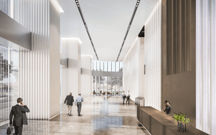 约11米层高,融合“光辉未来”设计理念,以充满能量的线性符号和天花模块群设计,打造核心大堂气派形象。