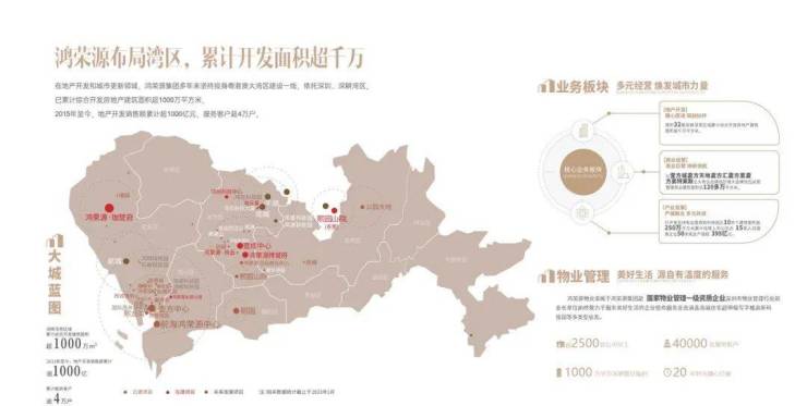鸿荣源,城市地标缔造者,与城市共荣,汇集鸿荣源32年匠心精铸,传承“誉”系精工品质,携超能标杆钜作,献礼湾区,鸿荣源32年稳健发展、布局大湾区,累计综合开发建筑面积超过1000万㎡。