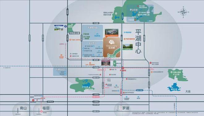 远洋城位于龙岗平湖山厦路与惠华路交汇处,东临广深铁路距平湖1.5公里,西临平湖金融服务业基地。远洋城,前身为平湖街道山厦旧村城市更新单元,总占地面积约22.3万㎡,总规划建面69.3万㎡,其中住宅分6个地块开发,规划1所九年制54班学校,全部建成后有22栋33-48层的住宅,2所18-43层高的办公,是一个集住宅、办公、商业、教育、公园于一体的综合体大盘。