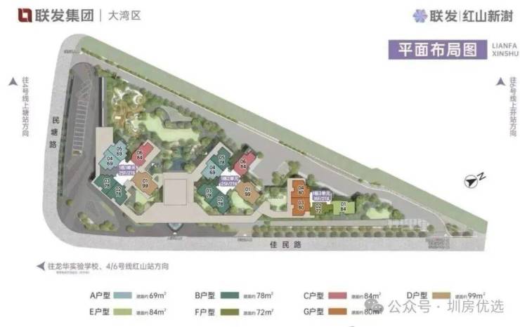 最新消息 龙华红山,联发新澍雅居预计二季度取证入市,户型相当炸裂,面积有69平的2+1房1卫,79-82平的3房2卫,99平的4房2卫户型,共332套房源,价格方面可以参考附近前期入市的联发臻著雅居,备案均价7.3万/㎡,当时折后均价约6.4万/平,期房精装交付。