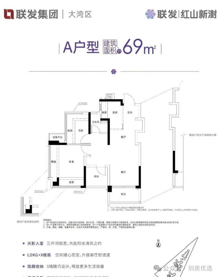 约69㎡的2+1房2厅1卫,设计的是竖厅LDKG+X格局,S墙设计预留冰箱卡槽位,做到了主卧双飘窗,三开间朝南,动静分区,U型大厨房,厨房烟道还做了外置空间,可以更好的利用厨房空间,卫生间三段式干湿分离。赠送了双阳台一半面积+5面飘窗+1个设备平台,超100%得房率,西南朝向。这是整个红山板块上车门槛最低的3房。