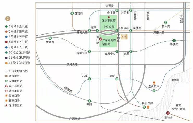 项目地处福田会展中心商圈,周边有多个大型商业:卓悦中心、岗厦城、会展中心、皇庭广场、cocoPark、大中华等;项目直线一公里范围内有多条地铁:1/2/3/4/10号线,最近地铁为1/10号线的岗厦站,步行约200米左右。