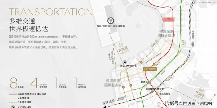【交通】立体便捷交通,更便捷高效出行距5号线妈湾站约550m,毗邻听海大道,可快速通达南山、福田、宝安及大湾区生活圈;规划8条轨道(城际+城市)、4条快速路、1条跨海通道(建设中)1个海空口岸(规划中)。