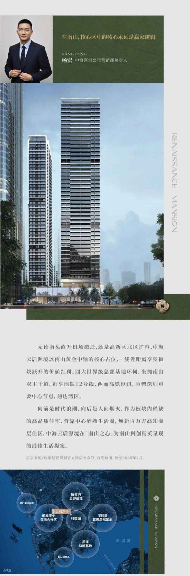 🔗科技园高知圈层聚集地——都心效率:项目立于科技园之上,与豪方天际花园、前海东岸构成纯粹高知的百万方社区氛围,焕新都心醇熟界面;以项目为圆心构建约三公里通勤圈,回应科技园精英家庭职住平衡的生活需求。(以中海云启源境为起点,以爱普生大厦为终点,百度地图测算步行距离约在三公里以内)