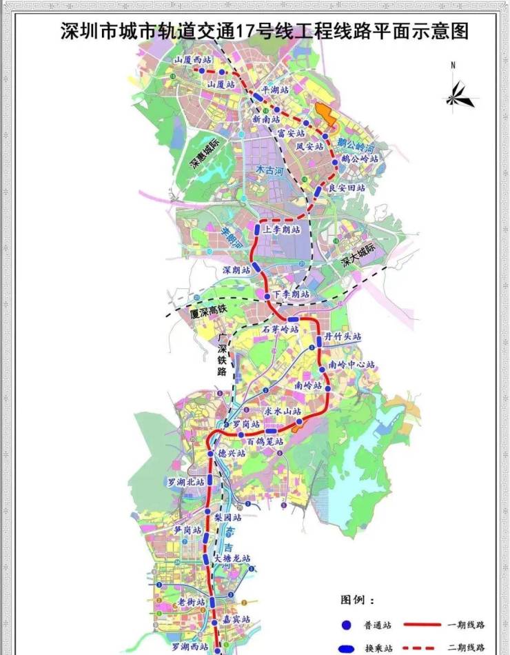 深圳地铁17号线全长约28.7公里,共设站25座,线路起于罗湖西站,终于山厦西站。其中,一期工程(罗湖西站-上李朗站)已于2023年10月10日开工建设,预计将于2028年建成通车。
