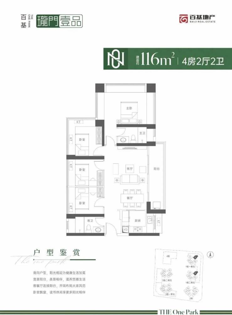 116㎡的4房2厅2卫,设计的是横厅南北通透格局,进门入户玄关,LDKB一体化设计,主卧南北通透,L型厨房,卫生间干湿分离,阳台主朝东南向。