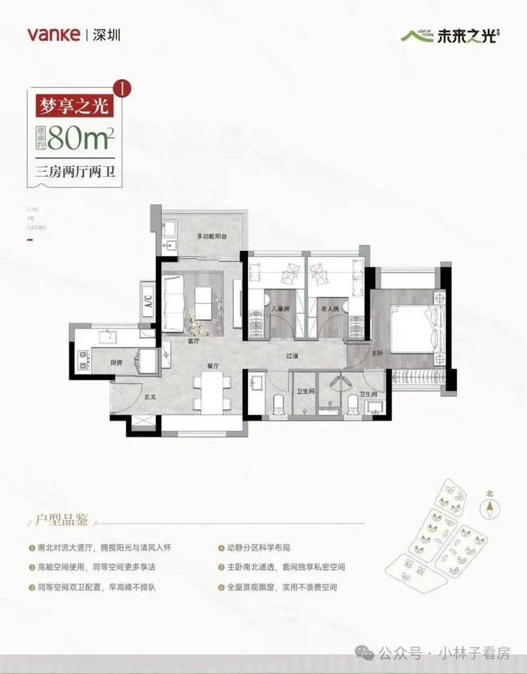 6、户型设计不错,别的开发商80平这个面积段只能做三房一卫,万科做到了三房两卫,功能性立马提升
