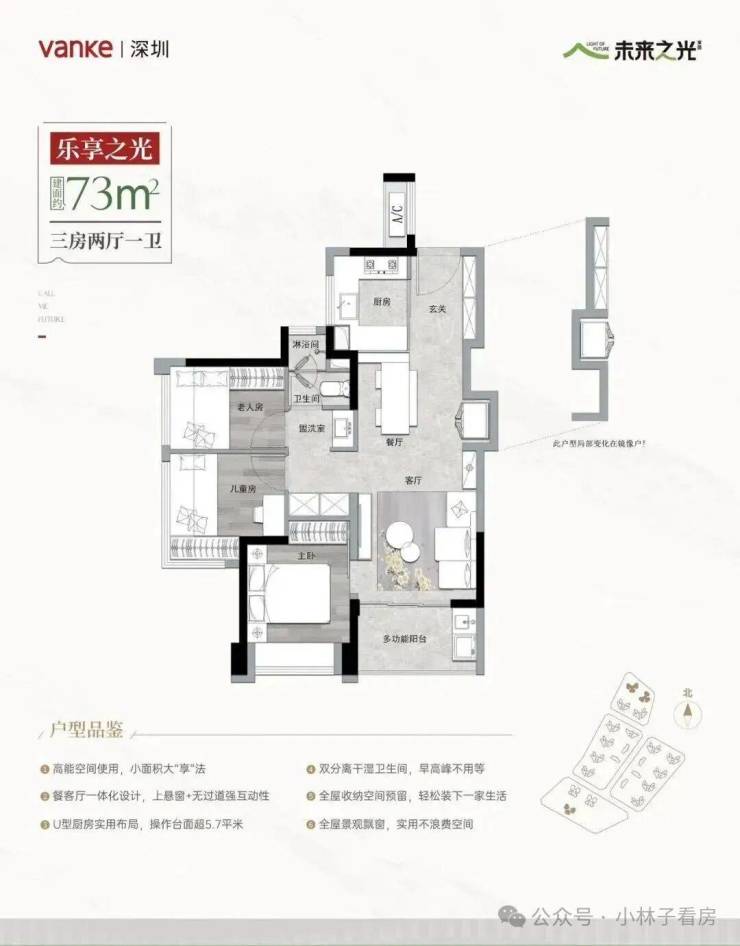 1、户型设计,73㎡可做三房一卫,80㎡做三房两卫,98㎡做四房两卫,这面积段和户型一看在深圳项目里是很稀缺的,看似面积小实际上因为小高层的设计,使用率是不输于市面上的其他产品的。