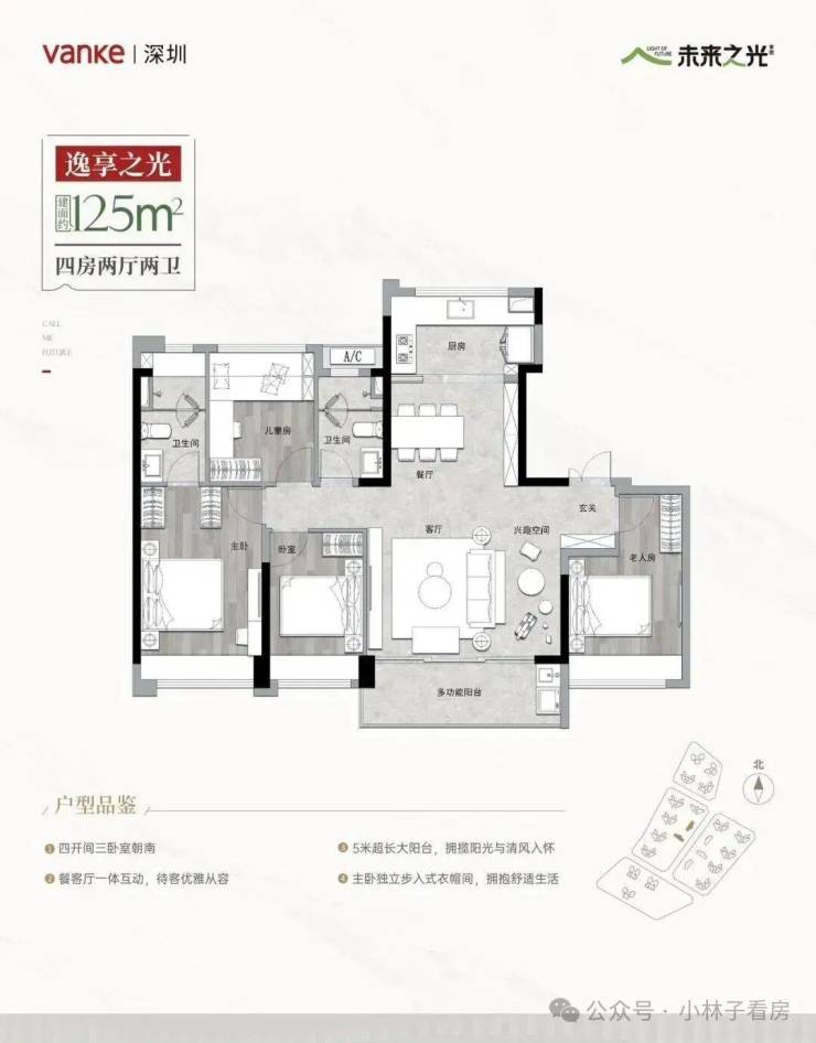3、万科未来之光属于尖岗山豪宅区,主打的就是低密度,高绿化率,容积率只有2.91,空气质量好,并且与繁华地带洪浪北有一个地铁站的距离,安静程度高,