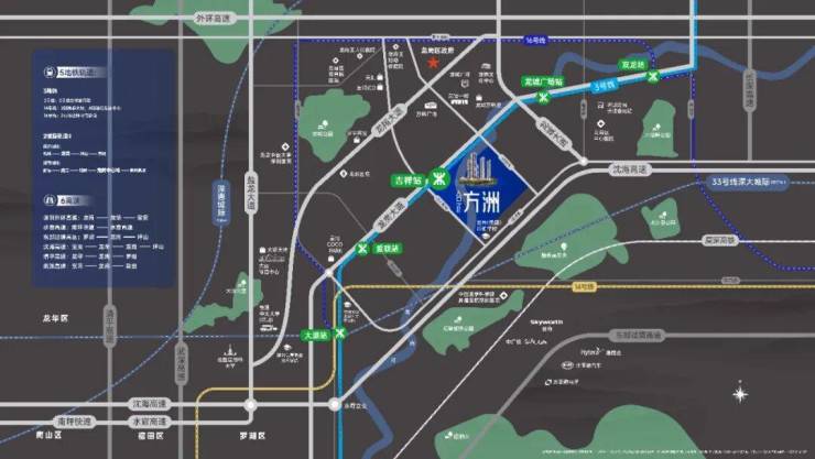 方洲无缝接驳地铁3号线吉祥站,两站换乘14号与16号线大运站,一部短剧的时间直达岗厦北。10分钟上水官高速、沈海高速,15分钟上外环高速,30分钟即达市内。
