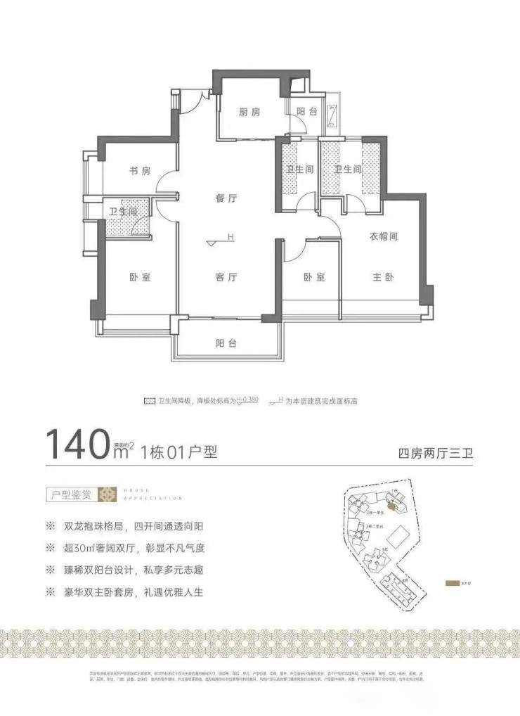 住宅由4栋48层建筑组成,分别是1栋、2栋1/2单元和3栋,3梯5/6户,4栋是商务公寓45F(1470户),5栋是幼儿园。