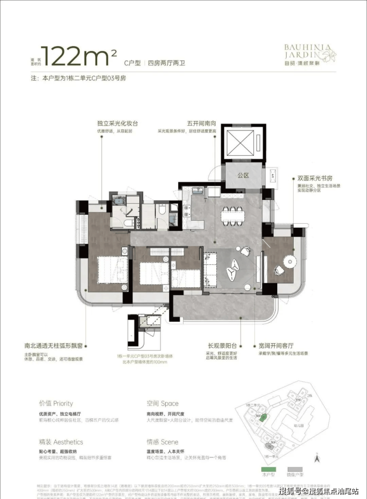 项目采用建筑新规设计,通过扩大阳台、凸窗赠送面积,实际使用率高达90-100%。以111㎡3+1房为例,独立电梯厅+6.5米宽厅+灵动空间设计,可自由切换"宽厅模式"与"四房模式",满足全生命周期需求。