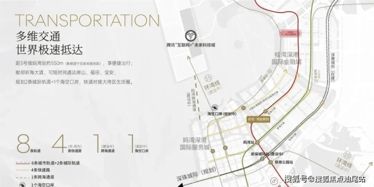 已通车的妈湾跨海通道(2025年1月通车)实现前海与宝安中心区15分钟直达,地铁5号线妈湾站(600米)、规划15/21/27号线及穗莞深城际形成"五线交汇",30分钟覆盖深圳湾、福田CBD及香港。