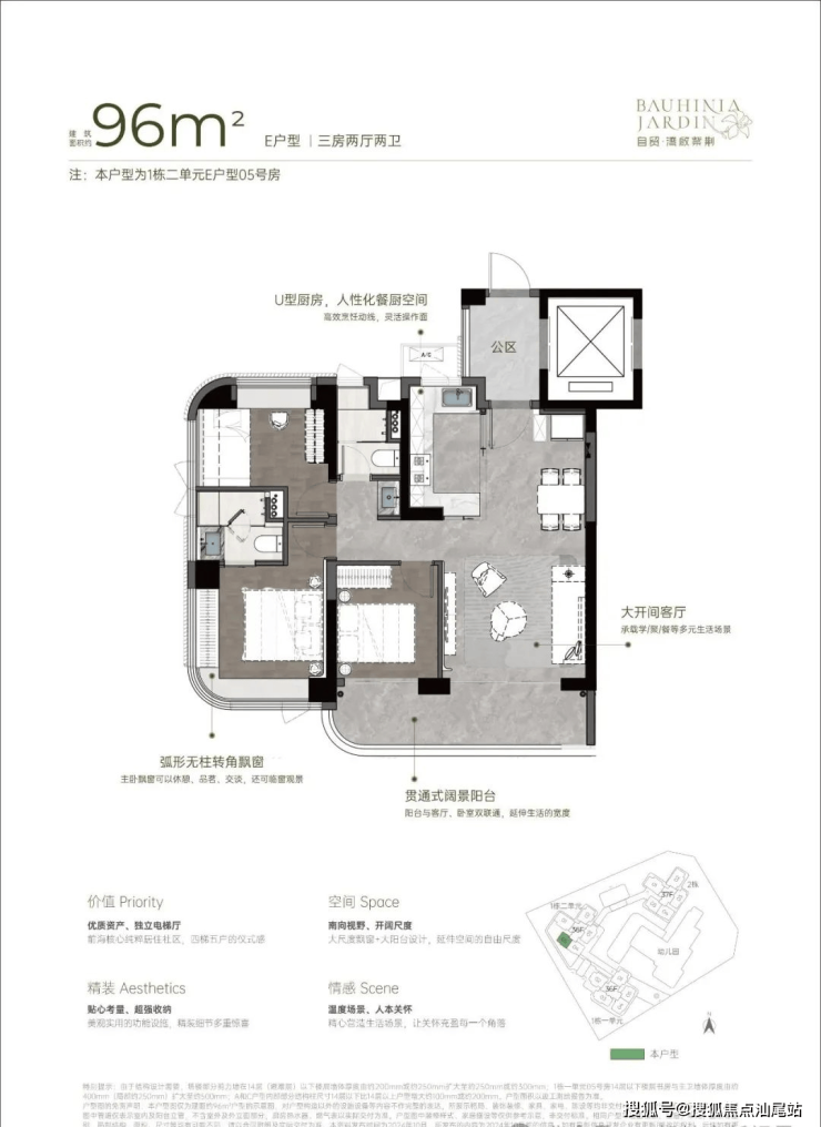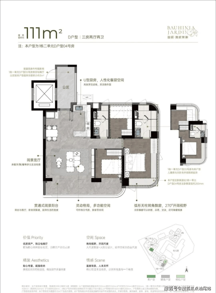 全屋配置大金中央空调、威能地暖、杜拉维特卫浴等国际一线品牌,主卫更贴心配置美妆冰箱。约6.1米开间横厅、U型厨房、三段式公卫等细节,均体现改善型产品的人性化考量。