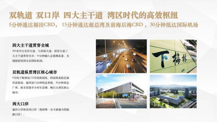 轨道口岸:享福田、皇岗双口岸,联动福田站、深圳北站双高铁,链接深港,对话世界。