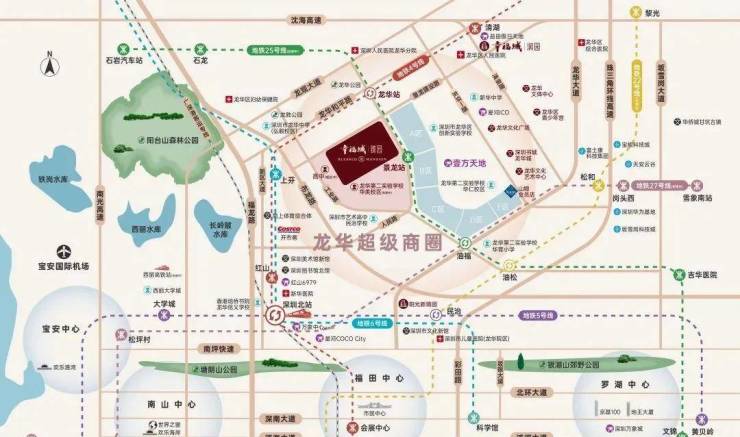 轨道交通:幸福城臻园目前距离最近的4、25号地铁线“龙华站”距离约400米,另外25号线“景龙站”距离约200米(在建),深大城际“民治北站”距离约2.5公里,3站到红山,4站到深圳北,5站到南山,7站到福田。