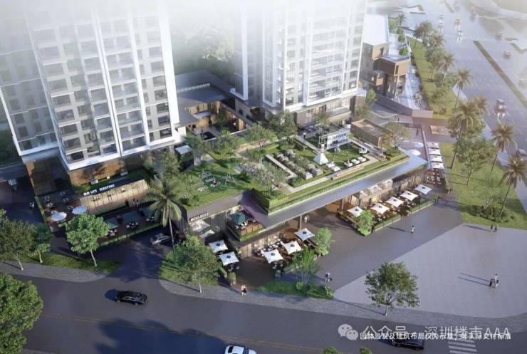 【抬高式檐上浮岛花园露台】:约1000㎡,位于商业街区顶层,业主私享花园露台,提供丰富空间活动区域,是邻里交流娱乐的理想场所。