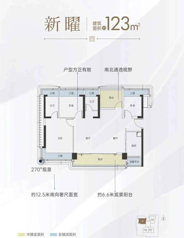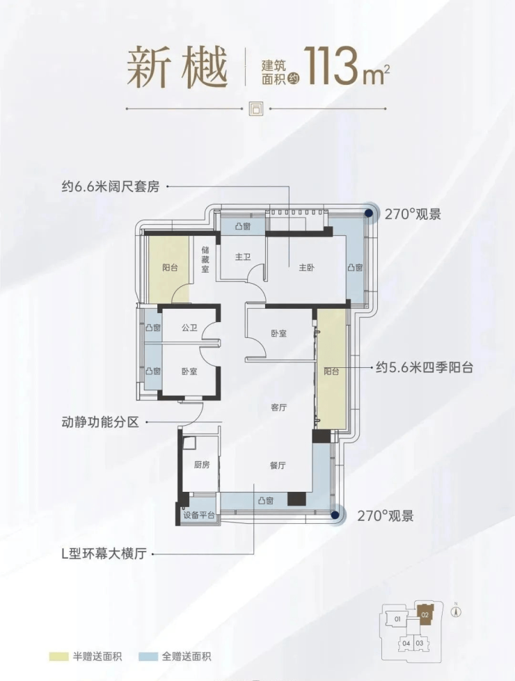 113㎡的4房2厅2卫,设计的是横厅南北通透格局,进门入户玄关,餐厅位双飘窗无敌视野,全屋6个飘窗面,客厅连接次卧出5.6米长的巨幕大阳台,厨房带1个设备平台,卫生间也带1个设备平台,得房率约95%(包含赠送),正东朝向。
