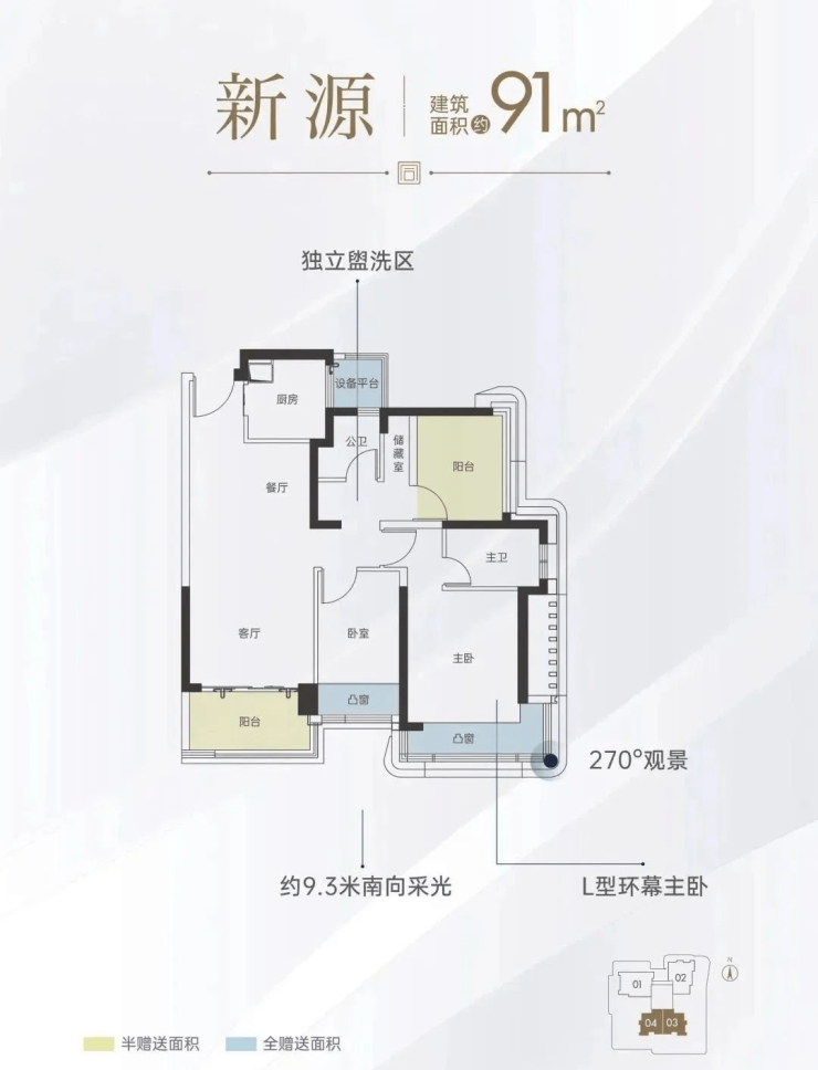 91㎡的3房2厅2卫,设计的是经典竖厅格局,进门入户玄关,客厅3.3米开间,三开间朝南,主卧转角飘窗带1个设备平台,厨房还带1个设备平台,得房率约90%(包含赠送),正南朝向。