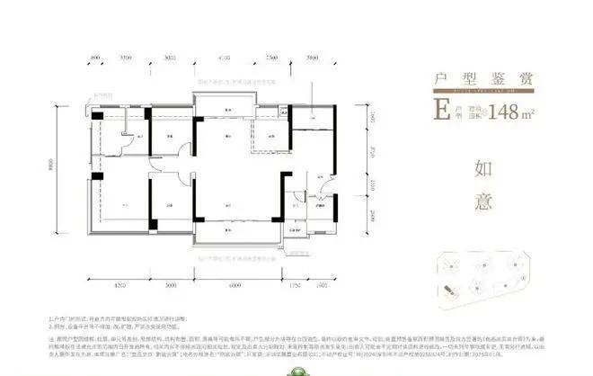 148㎡的4房2厅2卫,设计的是横厅南北通透格局,进门赠送约5㎡的前室入户,不在户型图内,客厅6米开间,LDKB一体化设计,横向宽敞大客厅,南北双阳台,可以改5房,主卧270°飘窗大套间,U型厨房,公卫三段式分离,得房率约79.45%(不含赠送),阳台主朝西南向。